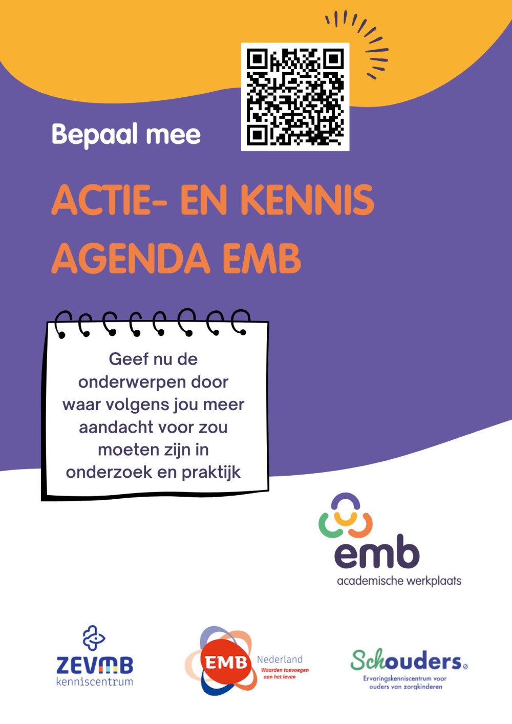 Om de behoeften in kaart te brengen, slaan EMB Nederland, Ervaringskenniscentrum (Sch)ouders, ZEVMB kenniscentrum en de onderzoeksorganisatie Academische Werkplaats EMB de handen ineen. Samen werken we aan een actuele kennis- en actieagenda voor (Z)EVMB, gebaseerd op wat naasten en zorgprofessionals belangrijk vinden als het gaat om de ondersteuning van mensen met (Z)EVMB. Dat doen we onder andere met een vragenlijst. Op basis daarvan kan de kennis- en actie agenda (Z)EVMB opgesteld worden. De resultaten worden teruggekoppeld aan het ministerie van Volksgezondheid, Welzijn en Sport.